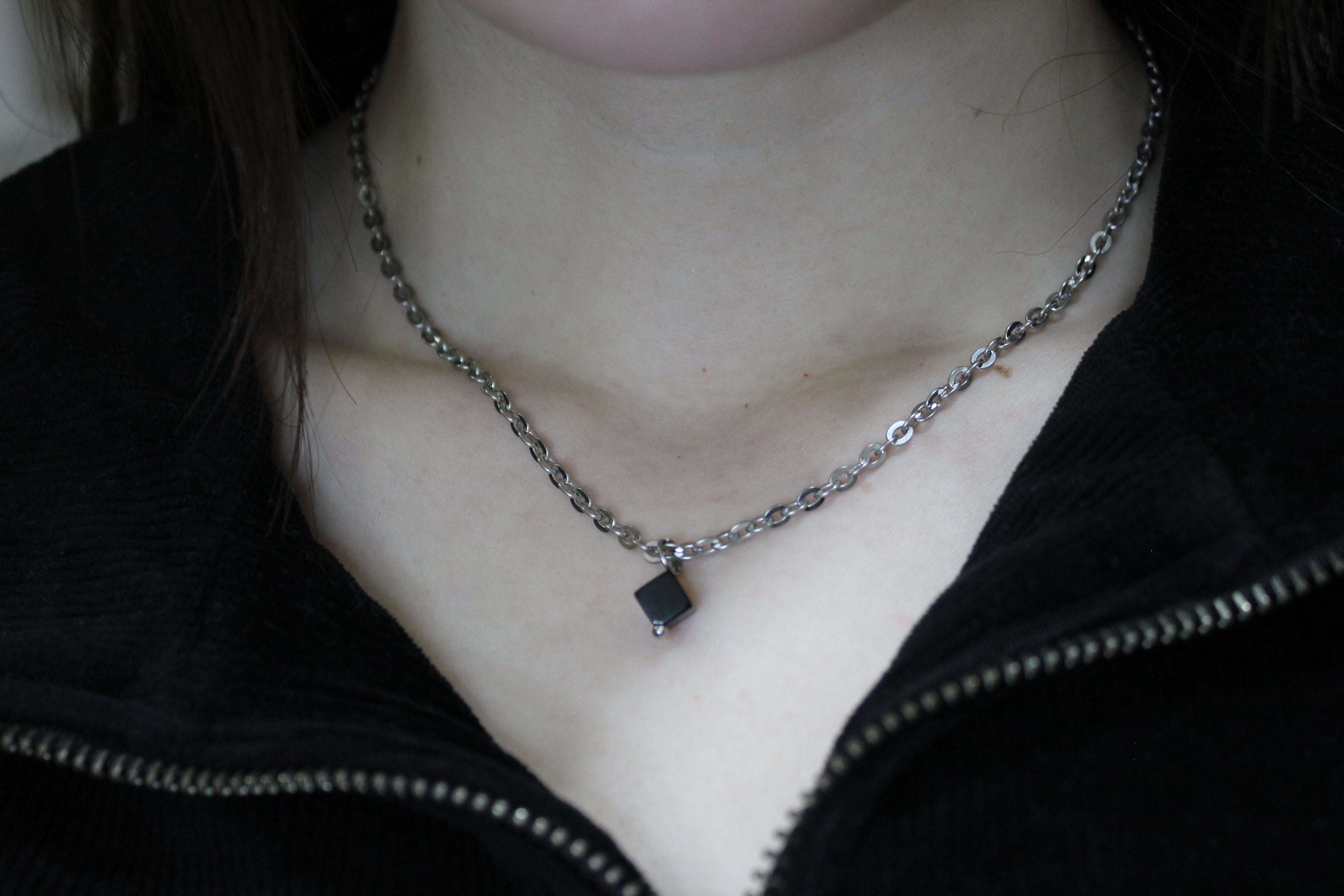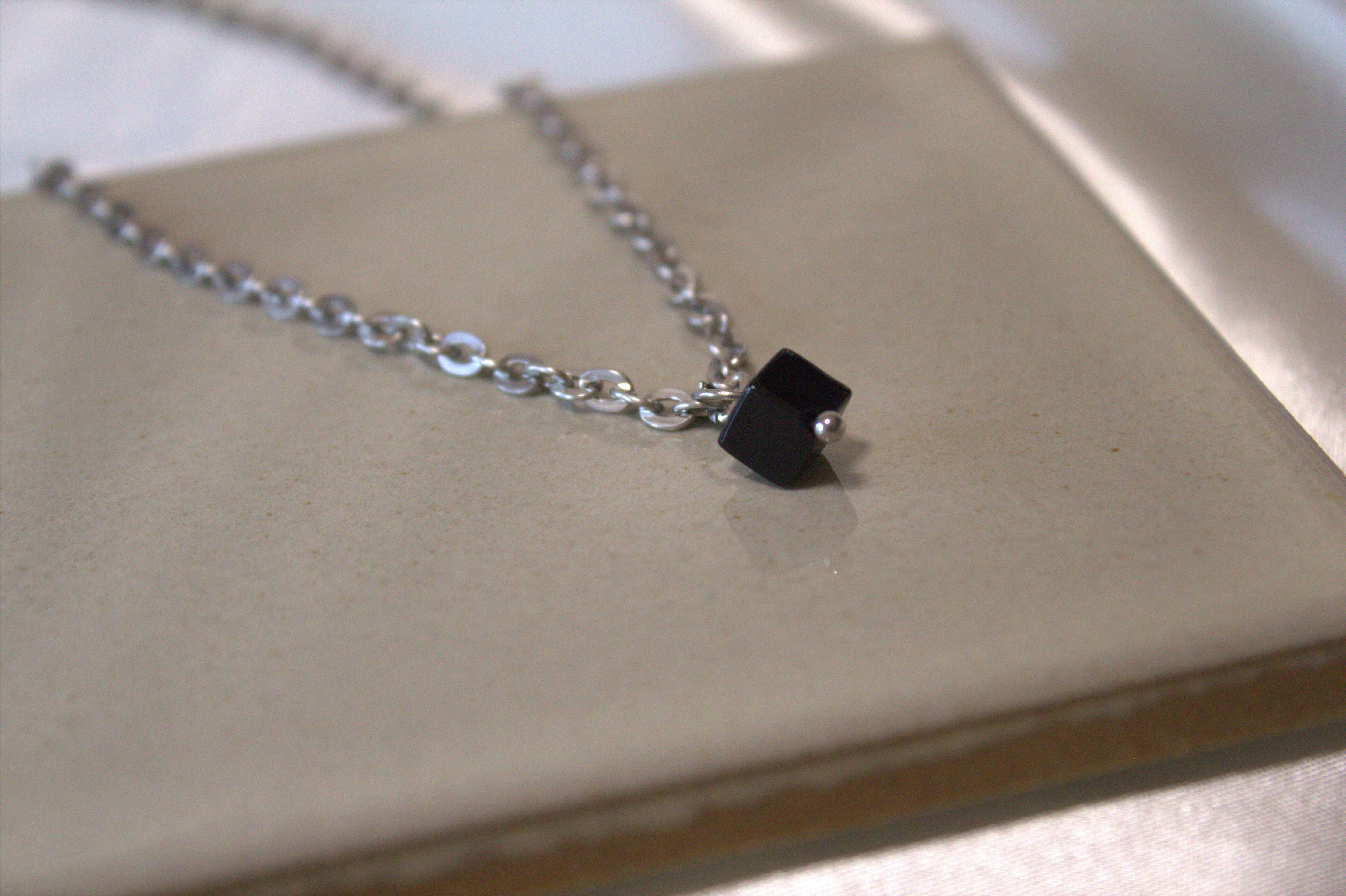 深く艶のある天然石「オニキス(黒瑪瑙)」を立体感のあるキューブカットで仕上げたネックレス。